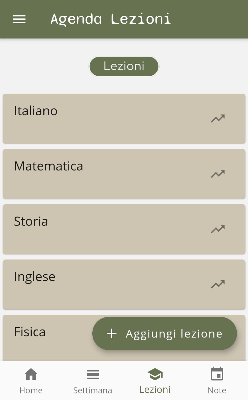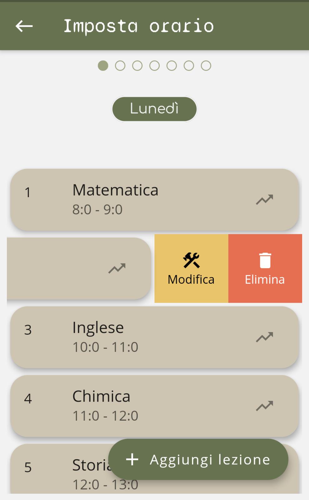 Una volta aggiunta la materia si tornerà nel menù delle lezioni, scorrendo da destra a sinistra sulla lezione sarà possibile modificarla o cancellarla